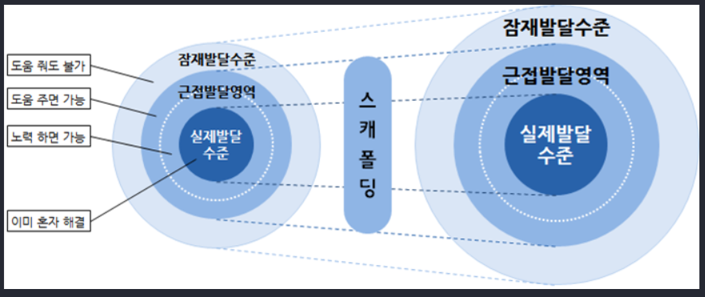 또한 아동 스스로의 힘으로 문제를 해결할 수 있도록 유능한 교사, 부모, 또래가 적절한 안내와 도움을 주는 것을 비계설정(scaffolding)이라고 한다. 비계는 원래 건축학에서 사용하는 용어로 건물을 짓거나 수리할 때 건축재료 등을 손쉽게 운반할 수 있도록 도움을 주는 장치를 말한다. 근접발달영역 내에서 성인이 아동에게 적절한 도움을 주는 것을 수행 수준에 따라 도움을 조절하거나 직접적으로 지시하는 역할을 하게 된다. 근접발달영역은 학생의 인지발달뿐 아니라 교사의 교육활동에 있어서도 매우 중요한 개념이다.