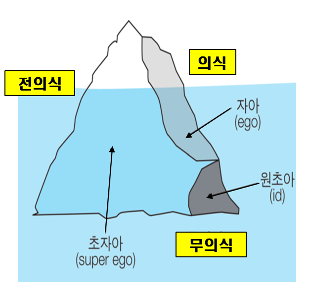 무의식(unconsciousness)은 물속에 잠겨 있는 큰 부분으로 의식의 하부에 존재하는 죄책감, 열등감,상처받은 경험, 성적 욕구, 공격 욕구 등이다. 이런 것들은 의식 세계에서는 감당하기 힘든 것들이라서 의식세계로 올라오면 심한 불안을 느낀다. 이러한 무의식은 의식세계로 올라오지 않도록 자아는 많은 정신 에너지(psychic energy)를 사용하여 억압해 버린다.