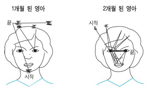 영아 1개월에는 양육자의 얼굴 윤곽만 응시하고, 2개월 영아는 얼굴 안에 있는 입, 눈, 머리 부분을 더 많이 응시하는 것으로 나타났다. 3개월경부터 양육자의 얼굴에 대한 도식이 형성되어 친숙한 양육자와 그 외 낯선 사람을 구별할 수 있을 정도로 발달한다(Shaffer, 2002).
