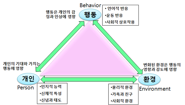 이와 같이 반두라에 의하면, 인간은 어떤 식으로 행위하느냐에 따라서 환경에 영향을 미치며, 이렇게 변화된 환경은 다시 자신의 후속행동에 영향을 미치게 되기 때문에 행동, 인간, 그리고 환경의 세 요소는 교호작용을 한다는 것이다.