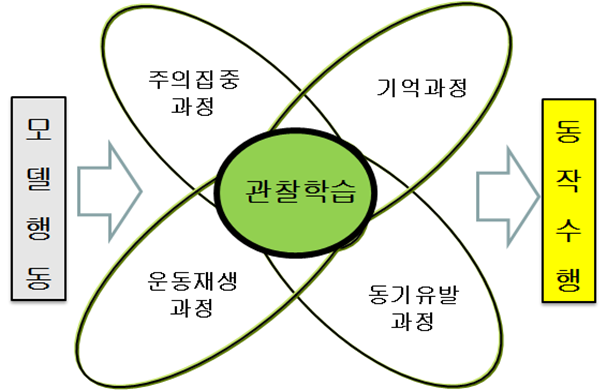 인간에게 바람직한 행동을 조성하기 위해 바람직한 행동모델 및 환경을 활용하도록 학습 요소를 제시해야 한다는 점이다. 이에 인간의 발달 과정은 외적인 환경자극과 내적인 사건과의 상호작용을 통해 결정되는 상호결정론(reciprocal determinism)모델을 제시하였다. 이러한 관찰학습은 주의집중 과정, 기억 과정, 운동재생 과정, 동기유발 과정이 반드시 필요하다. 이 네 가지 중에서 한 가지라도 빠지면 사회학습이론의 모형은 불완전하게 되므로 성공적 모방이 이루어지지 못한다. 반두라의 사회학습이론은 관찰학습 또는 모델링(modeling)이라고도 하는데, 이러한 관찰학습의 과정을 단계별로 나누어보자면 네가지 단계로 분류할 수 있다.