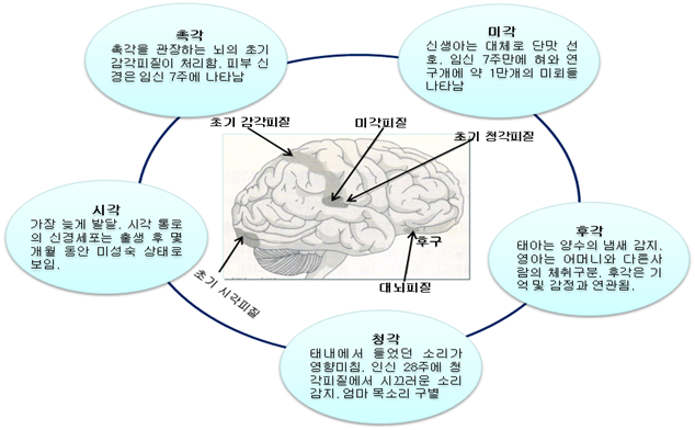 출샌 후 감각적인 특징과 두뇌의 발달 기능과 연계성은 다음과 같다.