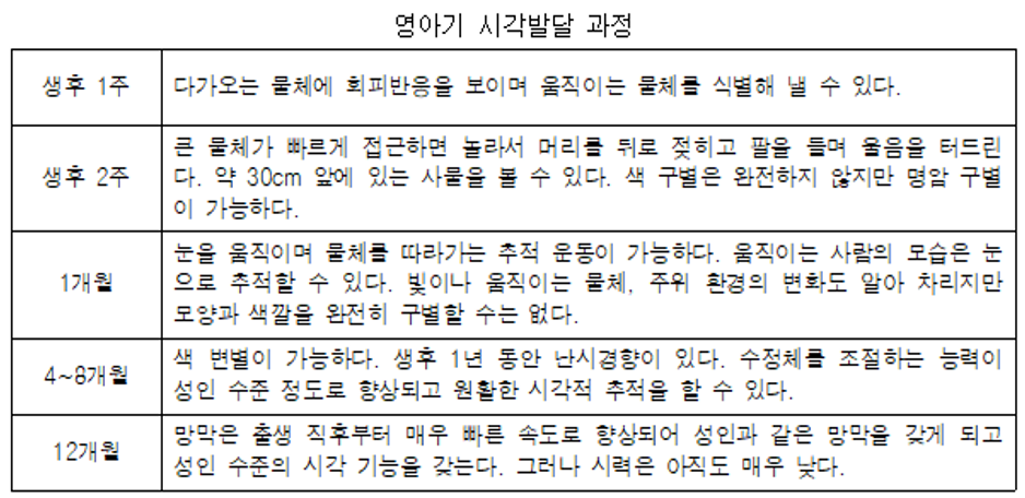 시각은 출생 후 여러 감각 중 가장 늦게 발달하는 감각능력이다.