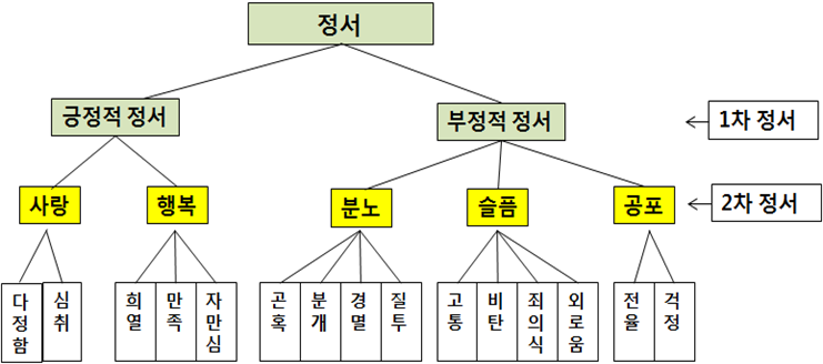 정서표현은 가장 기본적인 일차 정서(primary emotions)와 일차적 반응 이후에 나타나는 이차 정서(secondary emotion)로 구분한다.