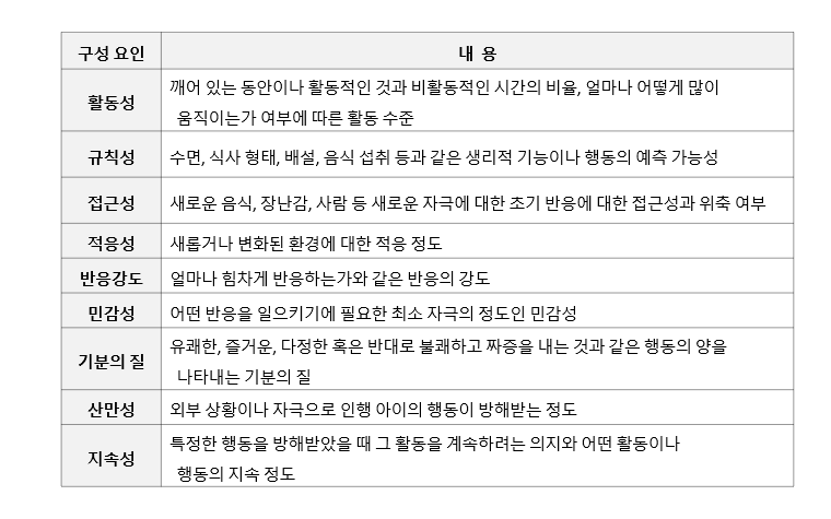 아이는 출생 후 각자의 기질적 특성에 따라 독자적인 양육이 필요하며 양육자는 기질에 적합한 방식으로 반응하고 양육하도록 노력해야 정상적 발달을 지원할 수 있다. 토마스와 체스(Thomas & Chess, 1977)는 기질 차원인 활동성, 규칙성, 접근성, 적응성, 반응강도, 민감성, 기분의 질, 산만성, 지속성으로 구성 요소를 주장하였다.