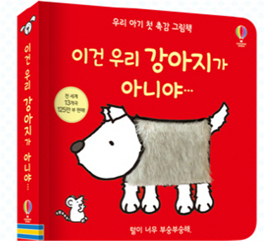 일반적으로 접하는 종이로 된 책, 외형적으로 다양한 질감 형태를 지니는 그림책이 알맞다. 내용은 짧고 단순한 문장으로 표현된 이야기가 갖는 반복적인 운율과 리듬감에 흥미를 느끼고 반응한다. 예를 들면, ‘이건 우리 강아지가 아니야’는 표지 강아지 모습의 일부분에 털로 구성하여 질감과 촉감을 느낄 수 있도록 하였다.