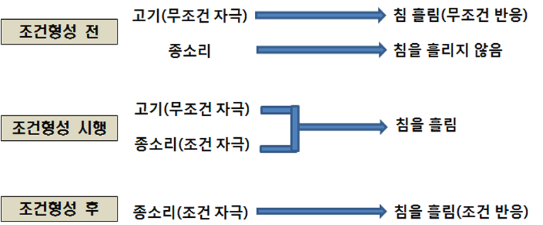 첫 번째 단계에서 개는 먹이를 주면 무조건 침을 흘린다. 이때 먹이는 무조건 자극이고, 침을 흘리는 것은 무조건 반응이다. 다음 단계에서 개에게 음식을 제공할 때마다 반복적으로 종소리를 제시한 결과 이후 개가 음식이 없이 종소리만 듣고도 타액이 분비되는 조건화된 반응이 나타났다.