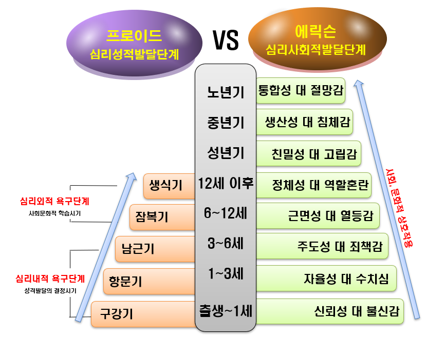 프로이드와 에릭슨의 이론은 갈등 구조가 인간의 발달에 많은 영향을 미친다는 것을 강조하였다. 발달과정을 단계적으로 접근하면서 질적 차이와 독특한 특성으로 진행된다는 점에 인간의 성장과정을 설명하였지만 과학적인 근거를 제시할 수 있는 정확성이 결여되어 있다. 프로이드와 에릭슨의 차이점을 알아보고자 한다.