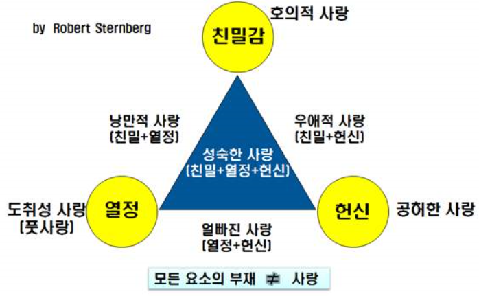 예일대 심리학과 교수 로버트 스턴버그는 사랑의 삼각형 이론을 제시하였다. 이는 사랑이 친밀감, 열정, 헌신이라는 세 가지 요소가 균형을 이루게 도면 성숙한 사랑을 할 수 있게 된다고 하였다. 스턴버그 이전에는 사랑에 관한 논의가 대부분 사랑의 정서적인 측면에서 접근하였다.